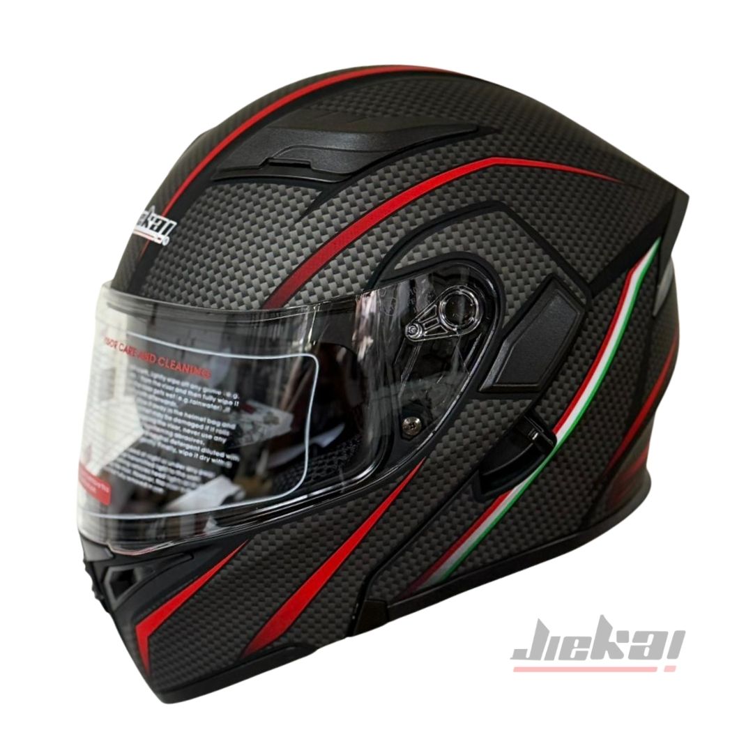 JIEKAI JK-902, modern sürücüler için tasarlanmış çene açılır mekanizması ile hem tam kapalı kask güvenliğini hem de açık kask pratikliğini bir araya getirir. Karbon desenli özel tasarımıyla dikkat çekerken, çene pedi sayesinde ekstra konfor ve koruma sağlar.