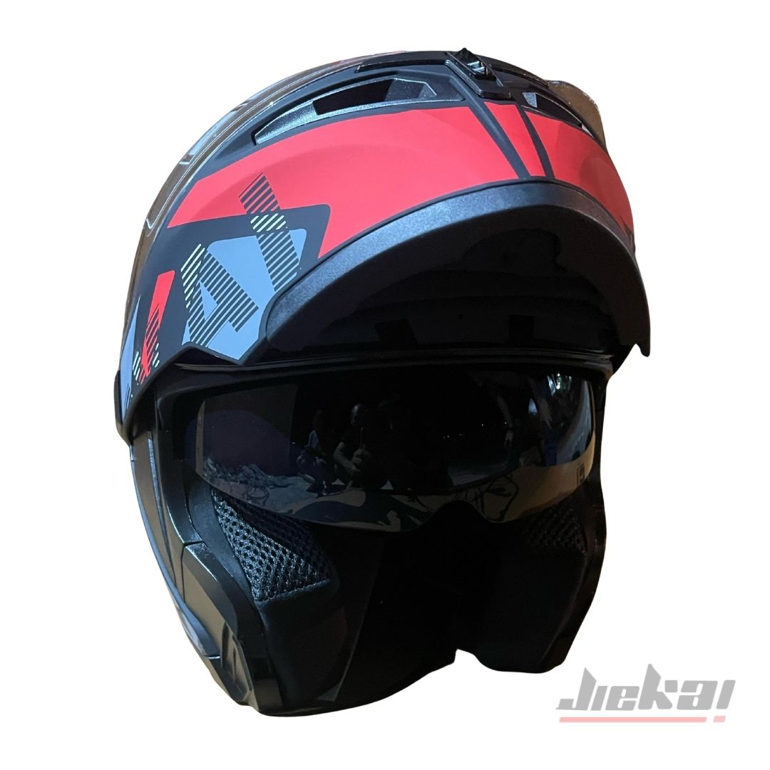 JIEKAI JK-902, modern sürücüler için tasarlanmış çene açılır yapısı sayesinde hem kapalı kask güvenliğini hem de açık kask rahatlığını bir araya getirir. H1 kırmızı çizgili tasarımı ile dikkat çekici sportif bir görünüm sunarken, çene pedi ekstra koruma ve konfor sağlar.